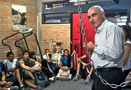 Ref.: El Decano de la Facultad de Actividad Física y Deporte, Lic. Jorge Gómez, visitando recientemente junto a la Lic. Mariana de Ferraris, el Lab de UFlo Comahue. Los eslabones de la cadena forman parte de la estructura del Dinamómetro Computarizado (Ergotester, Globus, Italy) utilizado durante la Experiencia Teórico Práctica referida a “Activaciones Musculares” que se viene desarrollando sistemáticamente en el Lab desde fines de los ’90, con alumnos de la Materia Fisiología de la Motricidad, pertenecientes al 2º año de estudios de la Licenciatura en Actividad Física y Deporte.