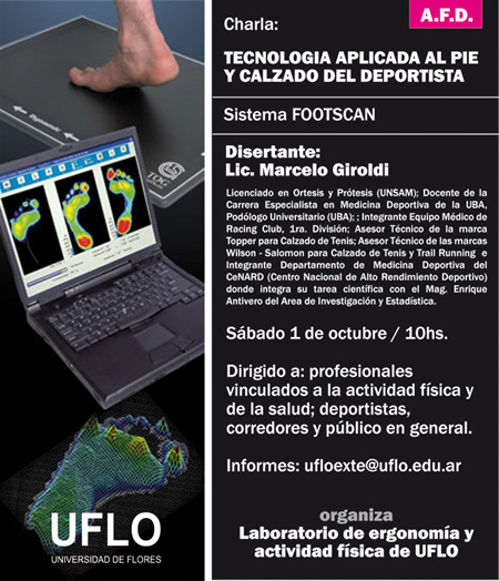 Vinculado con el Proyecto, queremos agradecer la predisposición del Equipo de Extensión Universitaria por su acompañamiento en la coordinación de la Charla de “Tecnología Aplicada al Pie y Calzado del Deportista” realizada en Octubre próximo pasado, en la cual disertó el Ortopedista Marcelo Giroldi, quien como pionero en la utilización del Sistema Footscan en Argentina, tuvo la responsabilidad de la confección de las Plantillas Ergonómicas requeridas para nuestro nuevo estudio.